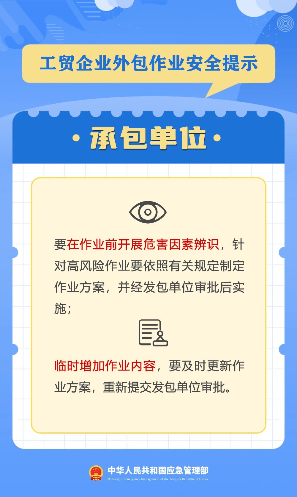 2025年10月以来,全国工贸企业共发生3起较大生产安全事故,均是由于外包作业漏管失控导致,教训十分深刻。为推动各地和相关企业加强外包作业安全管理,有效防范遏制事故发生,应急管理部向工贸企业发出外包作业安全提示。